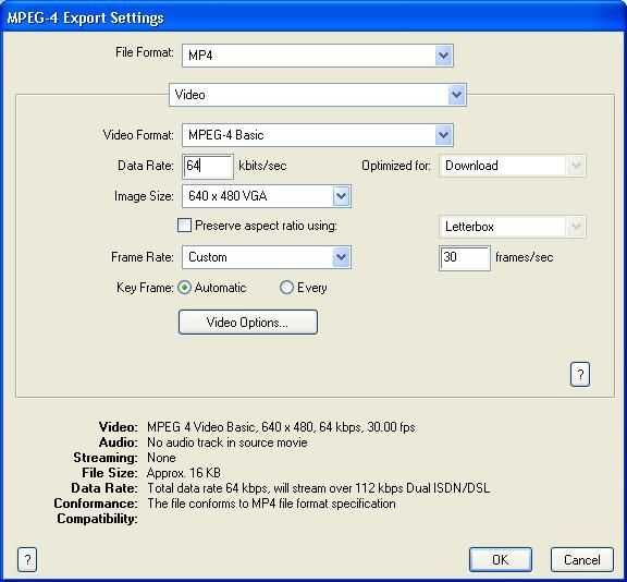 Si desea que su video a racionalizarse para Youtube, seleccione "película a MPEG-4" en el cuadro de diálogo de exportación, haga clic en el botón opciones para cambiar las opciones más alrededor. He incluido una imagen con algunos ajustes, pero no soy muy bueno con cosas de video, así que experimento para encontrar lo que adapte a sus necesidades.