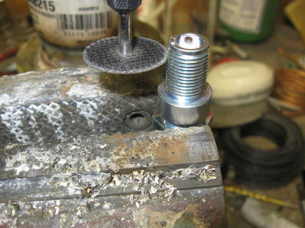 Primero con cuidado cortar algunos if el extremo roscado para exponer la chaqueta base de cerámica. Esto permitirá el espacio soldar una tuerca a la base de cobre.