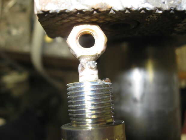 Decidí soldar una tuerca de bronce de 10-24 hasta el final del negocio del enchufe y utilizar el extremo de conector de cable de enchufe como conexión elevada para el elemento de la cámara.