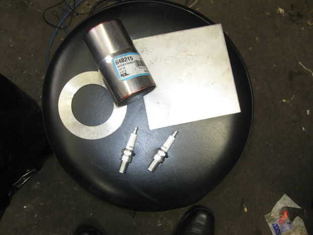 El plato principal es un cuadrado de placa de la canalización vertical es un reductor de tubo de escape y la brida es un reborde de la pipa de SCH 40 de 6 pulgadas. Costo total $1 por libra.