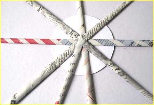 a continuación, cortar 2 círculos de una cartulina. Pegue un número impar de periódico enrollado de forma que se asemeja a una rueda de radios.