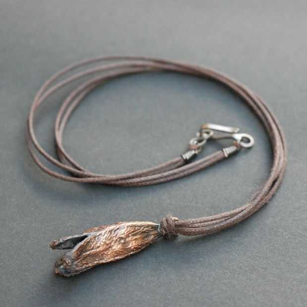 Después de sacar desde el cable conductor, echar mis objetos hígado de pátina de sulfuro, que da un acabado en negro oscuro. Entonces frote con lana de acero que destaca las zonas levantadas, dejando los huecos negro oscuro. Luego uso una spray de laca para sellar el acabado y cadena en algodón cordones para un divertido collar de orgánico.