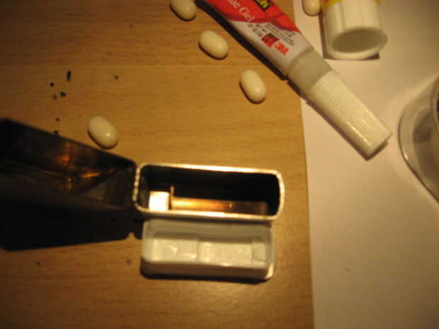 Medir la posición de la lengüeta en la tapa más ligero y la marca donde debe ir en la parte superior de plástico. porque el martillo de metal no tiene que cerrar completamente, está bien que la lengüeta de plástico un poco a la izquierda, en relación con la imagen.