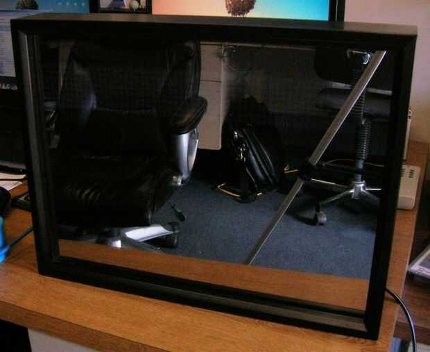 Después de todos los componentes básicos estaban trabajando, me corte un trozo del espejo de dos vías para adaptarse a la vitrina y había substituido su vidrio original con él. Con el display apagado, el espejo le da un efecto agradable.