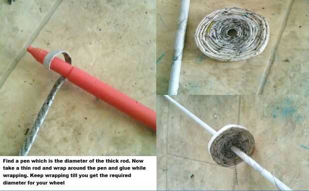 Ahora tome una varilla delgada y envolver y pegamento como vas... envuelven hasta obtener el tamaño requerido para la rueda.