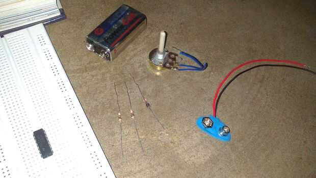 c) algunos componentes electrónicos: resistencias de ohm 2 x 100, 1 x 10 K resistencia variable (potenciómetro), IC de x LM324 1, 1 x pila de 9V (para la construcción de la parte del amplificador de voltaje)