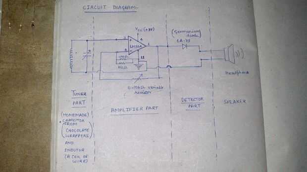 La parte del amplificador de voltaje de la radio consiste en un opamp con resistores conectados para formar una configuración de amplificador no invertir (arriba se muestra el circuito completo de la radio construida). Esta etapa amplifica las señales del circuito sintonizado de cerca de 200 veces si el potenciómetro está en su valor máximo. Usé un IC LM324 para el opamp, ya que puede funcionar en voltajes de la fuente de energía muy baja.