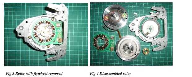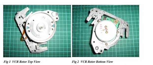 Las partes del vídeo fueron extraídas junto con sus soportes de montaje y tornillos, manteniendo intacto el PCB con las conexiones de impulsión del motor de cassette. El cableado para el rotor principal video no es necesario y puede ser desconectado. Higos 1 y 2 muestran la cabeza video como quitar desde arriba y abajo, higos 3 y 4 muestran los componentes del rotor desmontado e higos 6 y 7 la configuración montada. El primer paso es eliminar cualquier bits superfluos del rotor cabeza video, incluidos lo PCB y los bobinados por debajo (Fig. 3). Necesita sacar el volante con el aro magnético en el interior del rotor.