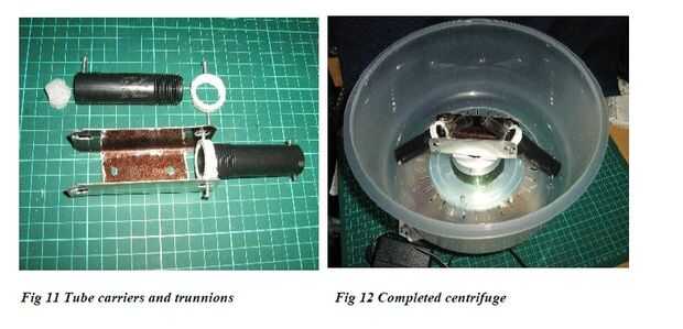Para completar la centrifugadora necesita añadir los muñones y anillos para llevar los tubos de la centrífuga. Los tubos de que uso son 100 mm x 12 mm de diámetro, así que hice dos portadores de tubo de tuberia de riego de plástico negro y los provistos de gorrones como se ilustra en la figura 11. Los muñones se forman de un collar roscado de PVC y dos tornillos autorroscantes. Un pedazo de goma espuma se empuja en la parte inferior de los portadores del tubo para amortiguar los tubos de vidrio, y otro tornillo se inserta en la parte inferior para sujetar los tubos en posición. El soporte de aluminio atornillado a la parte superior del rotor tiene agujeros sean los tornillos de soporte, como se ve en la Fig 12.