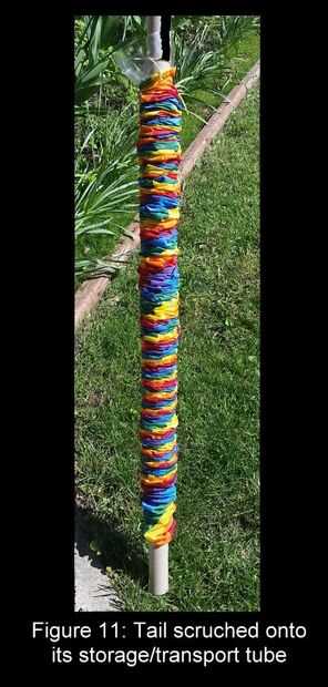 Hubo un aspecto en el que encontré mi cola blanco y negro comprada original no es totalmente satisfactoria. Era tubular en construcción, diseñado para llenar con el viento y soplo que voló. Pero vino envuelto firmemente en una bolsa para su almacenamiento, y después de usarlo, lo enrollada bien otra vez y vuelva a colocarlo en la bolsa. Esto por supuesto había aplanado la cola hacia fuera, y rápidamente encontré que incluso en un viento fuerte la cola no llene con aire ya que estaba destinado a hacer, pero seguía siendo plana en la mayor parte de su longitud. Puesto que convertiría el diseño que hacía que voló y producir un poco de efecto espiral, haciendo que se aplanen sería perjudicial para lograr esto, por eso he querido averiguar de una manera - si es posible - a convertirse en la más tubular en vuelo. Con ese fin, surgió la idea de utilizar a algún tipo de tubo un poco más pequeño en diámetro que la cola. Cuando ya he terminado del vuelo para el día, tomaré la cola y lo empuje hacia abajo sobre el tubo, reuniendo como ir, hasta que la cola entera es aplastada hacia abajo sobre el tubo (Figura 11). Esto, espero, fomentará la cola para adoptar una forma tubular que sea necesario para el aire. Descubrí que tenía un pedazo largo de 1 1/4" espesor cartón tubería (había utilizado algunas de ellas anteriormente para mi tejido madera Cruz Instructable) que funcionaría perfectamente. Tomó cerca de 3 pies de tubo de cartón para almacenar la cola entera, que ocupa mucho más espacio que simplemente firmemente la bobina en forma de bola, pero se vale si la cola mantendrá su aspecto tubular por guardarlo de esta manera.