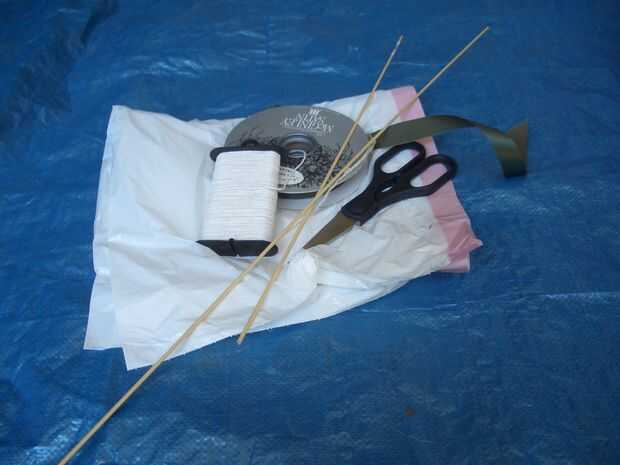 Se necesita: una bolsa de plástico, cuerda, dos palos, tijeras y cinta.