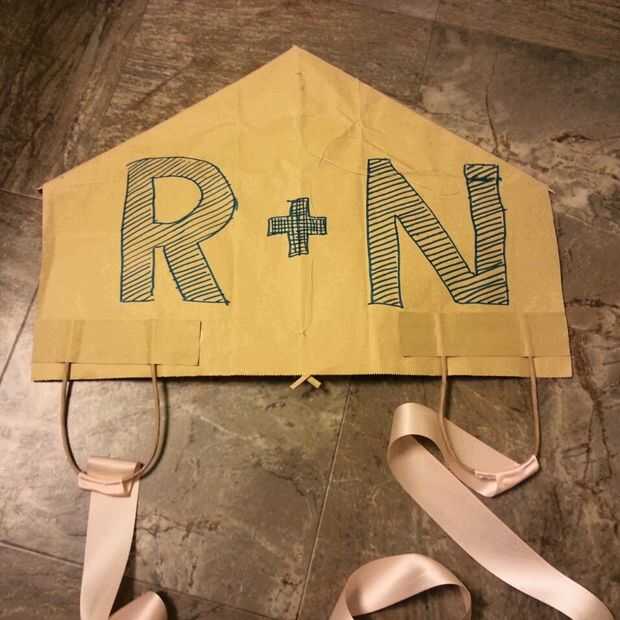 Para esto, robaron alguna cinta de la boda y pegado dos piezas largas para las manijas. Hizo para una hermosa novia cometa, especialmente después de plano a la novia y las iniciales de los novios en la parte delantera de la cometa.
