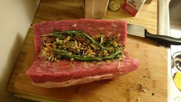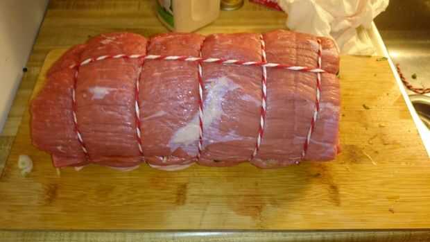 3.) cerrar la carne usando la técnica del laso con la guita para mantener las hierbas dentro y darle una forma redonda.