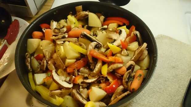 2.) chorrito de aceite de oliva y vino tinto en las verduras.