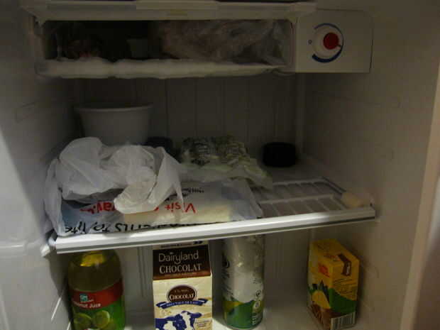 Sólo tenemos una nevera compartida en el salón, pero gente roba, por lo que es más seguro tener mi propia nevera. Sin embargo, es tan pequeño. Cuando compre carne, I separado en puño tamaño y guardarla en bolsas zip y congelarlo.