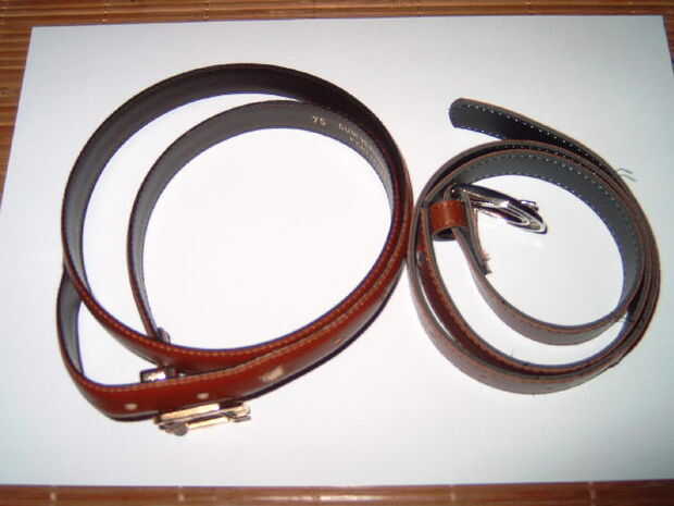 Compré mi correas de cuero en una tienda de segunda mano para un total de sólo 0,75$. No encontré una larga, así que tuve que comprar dos (por suerte encontré coincidencia unos), que trabaja así como bien. Usted puede utilizar cualquier material y color que desee, simplemente elegí cuero porque se ve muy bien y es muy fuerte.