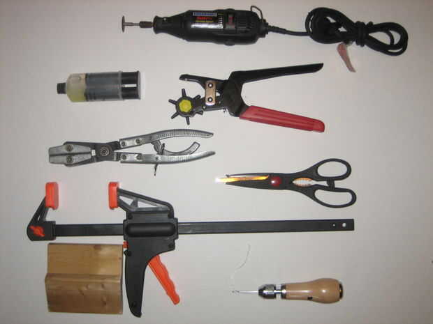 Bcontinuación es la lista de artículos que solía realizar este proyecto. Una voluntad de taladro con brocas adecuadas es un sustituto aceptable para el sacador de cuero, aunque los agujeros será un poco más ásperas. La lezna de coser podría no ser necesario si el epoxi es lo suficientemente fuerte, pero no quiero arriesgarlo. Yo quería hacer mi propio "titular de la ficha" (la parte que sostiene el sobrante del cinturón una vez que ha sido enhebrado a través de la hebilla), usé algunos agarres de barra y varias pinzas y acero. Probablemente puede hacer la correa con ningún titular de la ficha en todos, o el cinturón de donantes tenga uno adecuado. Un cúter muy afilado resistente puede funcionar en lugar de la Dremel, pero encontré mucho más fácil de usar en este material resistente el Dremel.