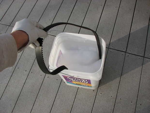 Llena un cubo con agua jabonosa caliente y pasó a ambos lados de la correa de distribución con un cepillo. Después de un enjuague y seque, corrí una toalla de papel blanco sobre ella y no conseguir cualquier manchas.