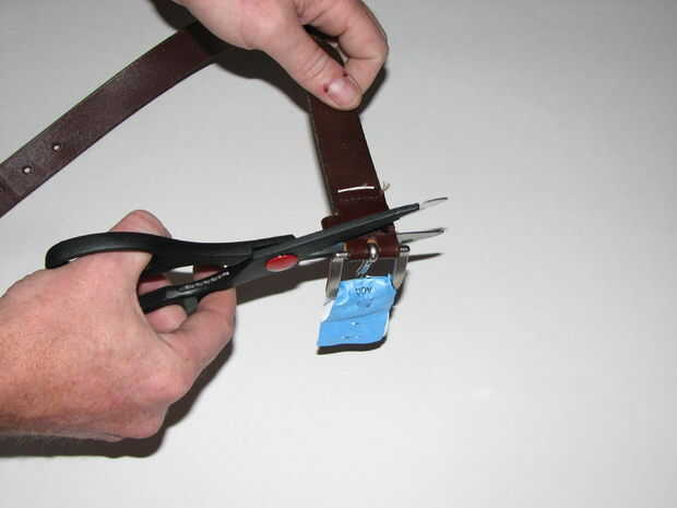 A continuación, corte la hebilla de su cinturón de donantes. Guardar la hebilla, así como la broca pequeña de cuero ranurado que llevó a cabo la hebilla.
