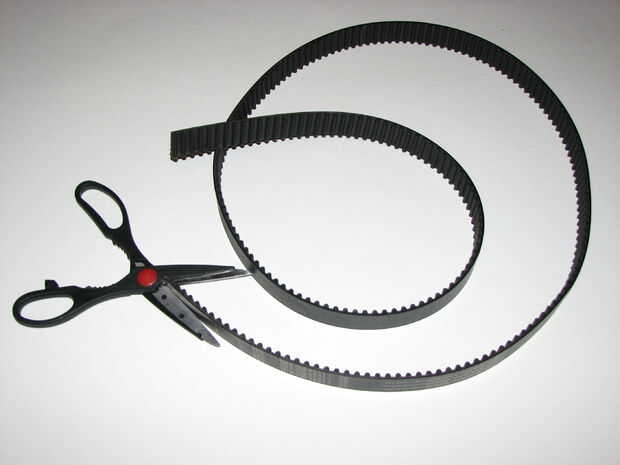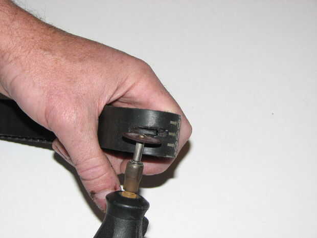 Este paso consiste en cortar la correa con la herramienta rotatoria Dremel. Produce gran cantidad de polvo de caucho y huele mal, le sugiero hacerlo fuera. Había perforado un agujero en cada extremo de la zona marcada. Usé el Dremel con una rueda de corte para corte entre los dos orificios y retire el material. Limpiar las asperezas de la ranura con un poco de pulido. Después de un par de ajustes de la prueba y modificaciones menores con el Dremel, estaba satisfecho con la ubicación de la hebilla y la libertad de movimiento.