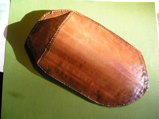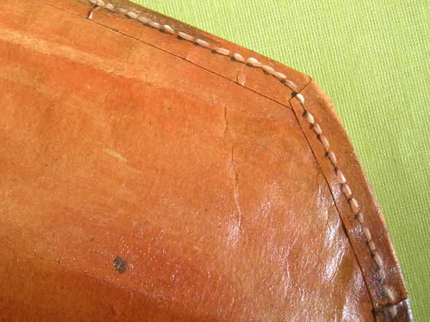 Por último, se agregan puntadas todo alrededor de los bordes. Para un efecto realista, la costura es pintada por 1, adición de puntos negros, 2, por lo que una sombra con un marcador negro, 3; adición de puntada con burnt sienna diluido con blanco y 4: agregar un toque de luz a cada puntada con un pincel liner y pintura vieja de pergamino (de blanco).