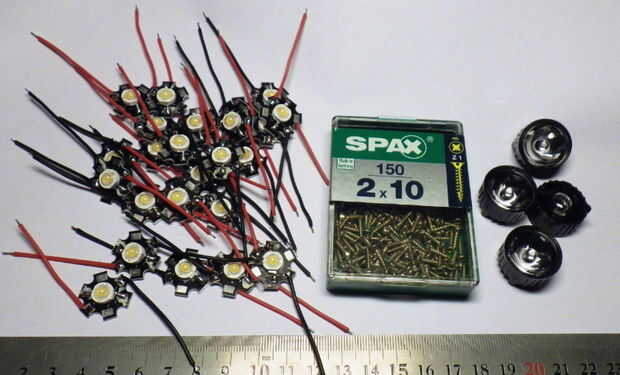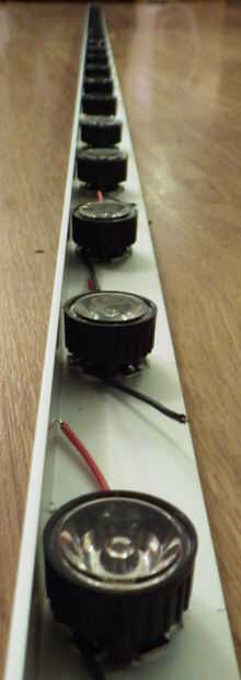 Cada base LED obtiene un lenguado de disipador térmico conductor compuesto en la parte posterior, antes de se sujeta entre el perfil de aluminio y el soporte del lente atornillando los soportes de lente por la parte posterior sobre el perfil de aluminio.