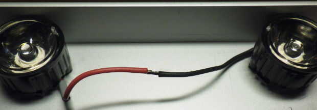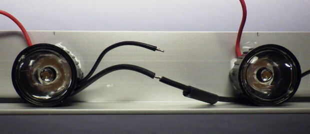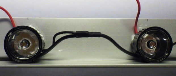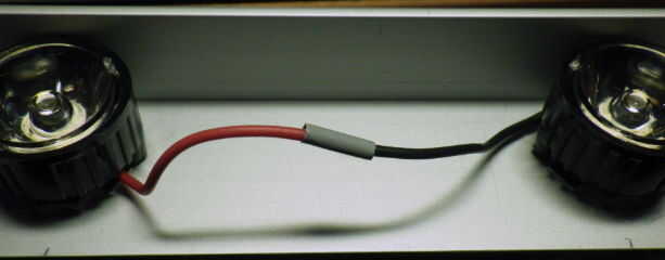 - cada grupo de tres LEDs está conectado juntos por soldar el cable rojo del e.g. izquierdo diodo al cable negro del diodo derecho