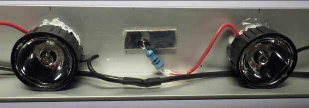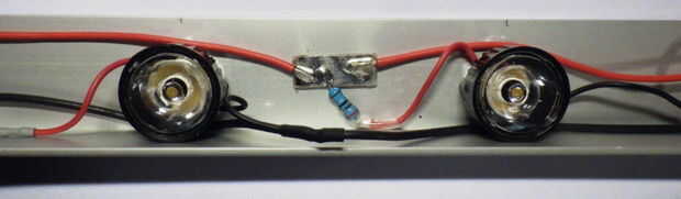 Como se explicó antes, la disipación de energía en el resistor de 1/2 W - habrá una corriente de 500 mA que causa un voltaje la gota de 1 V. Las resistencias que utilizan están clasificadas para la disipación de potencia de 2 W y yo les en pequeños trozos de placa revestida de cobre soldadas como separadores aislados del perfil de aluminio.