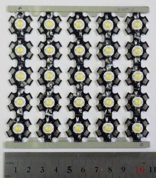 Por fin han llegado mis LEDs. He utilizado LEDs de energía de estrellas antes, pero nunca he visto en este tipo de marco - directamente desde la línea de producción. La soldadura sin duda parecía bien, pero había mucho residuo de fundente y disipador de calor compuesto alrededor de los chips en el fondo de negro la máscara en las juntas de soldadura.