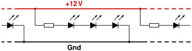Mi primer plan era construir un circuito controlador individual para grupos de tres LEDs en serie. Pero por otro lado, quería terminar este proyecto antes de la hora más oscura del año realmente situado en. Por lo tanto me decidí por el circuito mucho más simple que se utiliza también en el tipo ordinario de tiras de LED y bombillas de LED de muchos: tres LEDs en serie, conectada a una fuente de alimentación de V 12 con una resistencia en serie de cuentagotas adicionales.