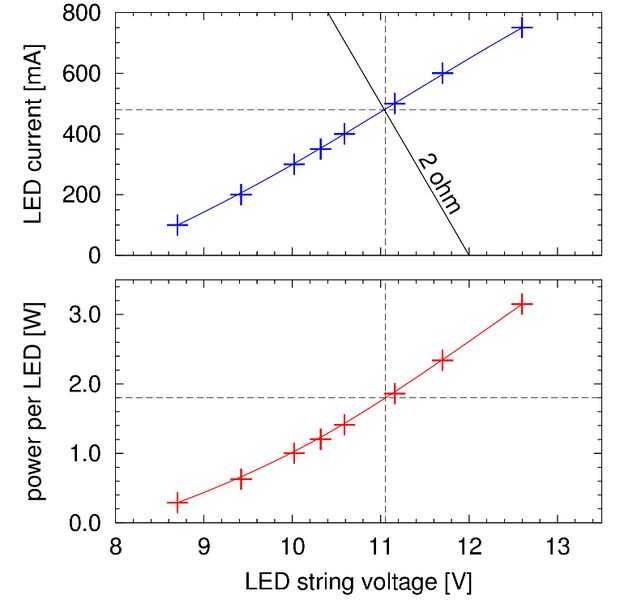 Como se puede ver, con una resistencia de 2 Ω y conectado a 12 V LED terminaría en un punto de trabajo con una corriente de 500 ligeramente abajo mA y una potencia de 1,8 W por LED. Un valor razonable creo y eso es también lo que fui.