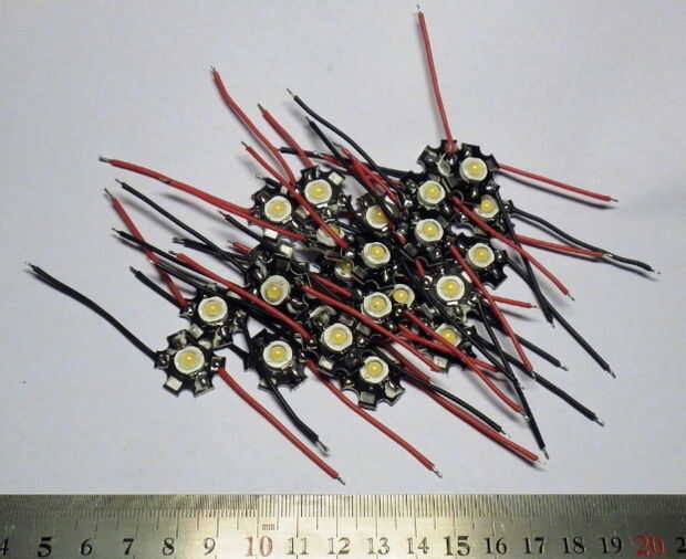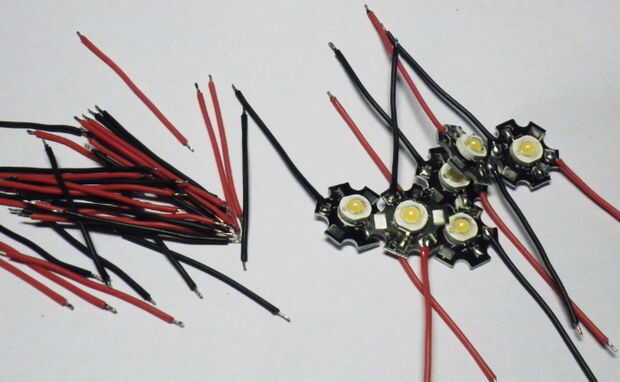 Preparé 24 piezas, cada 5 cm de largo, de cables rojo y negro del aislamiento y estañar los extremos. Para soldar los LEDs entre sí entonces soldamos un cable rojo al contacto positivo (ánodo) y un cable negro al contacto negativo (cátodo) para todos los 24 LEDs.