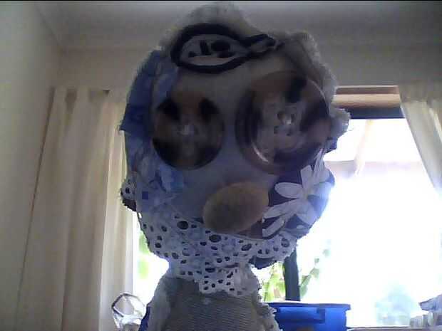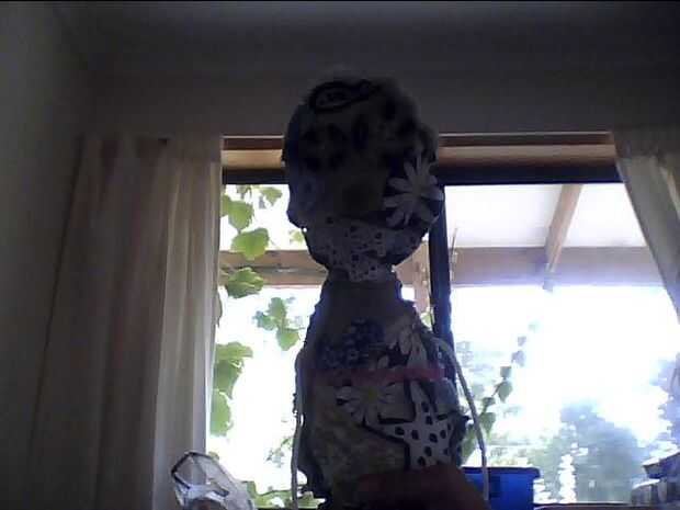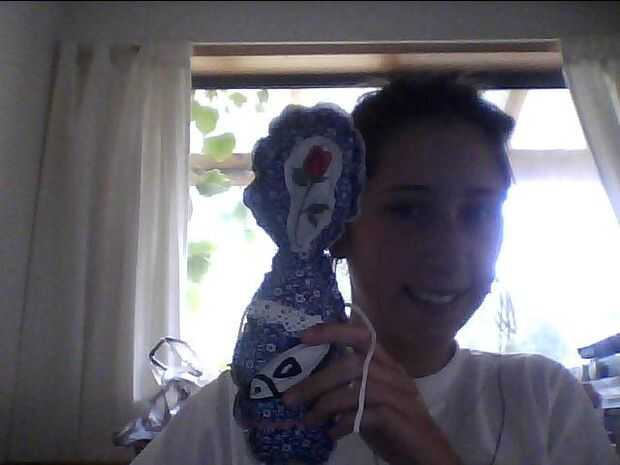 hice esta cosa al azar por un cuerpo básico de corte y costura al azar trozos de tela le. Tiene encaje, botones para ojos y nariz, al azar trozos de tela, una estrella de mar, algún estante de rick, un pez en su frente y de espaldas es algo azul flores de tela, una rosa, un pez, algunos encajes y algunos rick rack. Hice la espalda y delantero por separado, los cosieron y lo rellenas!!! Sus brazos y piernas se hacen sólo de bits aleatorios de cadena :) Él está enojado