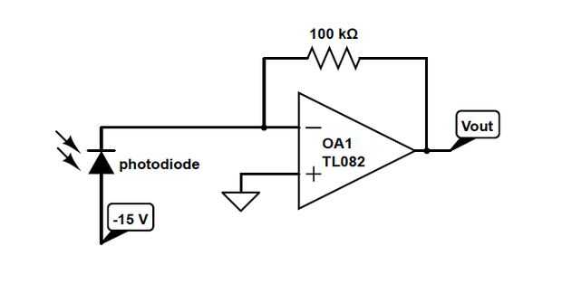 Esencialmente, lo que hace este circuito es que toma la corriente del fotodiodo: i(t) y se multiplica por R = 100kOhm para hacer Vout(t). Luego se mide Vout(t) con un osciloscopio, que le dirá cómo el corriente del fotodiodo es variando con el tiempo, y así cómo está variando la intensidad de la luz que el fotodiodo "ve" con el tiempo.