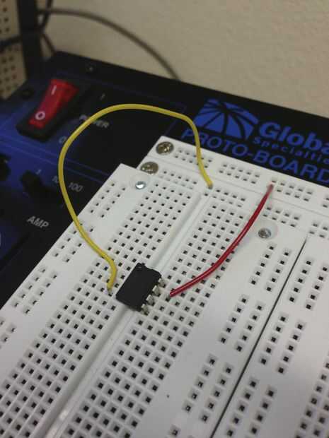 1. conectar la cuarta en el op-amp a la alimentación negativa (-15 V) con los cables de puente. Esto se demuestra con el cable amarillo.