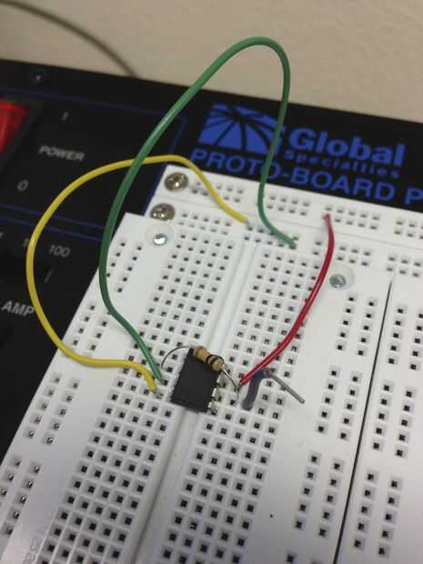 Conectar la tercera clavija a tierra utilizando un cable puente. El tercer pin es la entrada de "plus" o noninverting y está etiquetado como "+" en el diagrama en el paso 2. Este paso se muestra con el cable verde.