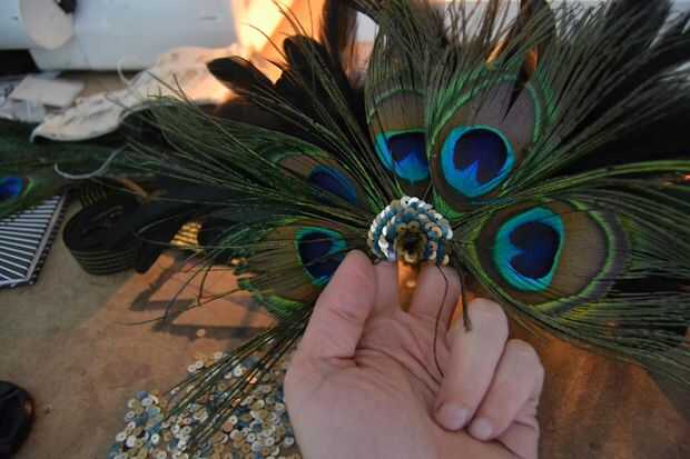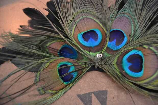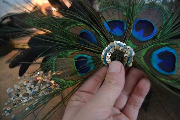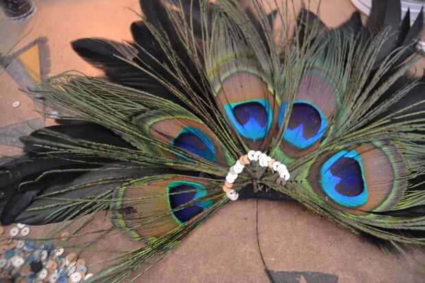 así que ahora que esta historia fue contada la sequining puede comenzar: lo que hice fue coser semicírculos concéntricos de lentejuelas sobre los extremos de las plumas de pavo real, también puede probar algo diferente, como cubre para arriba los extremos de las plumas.