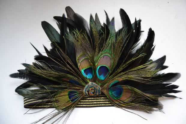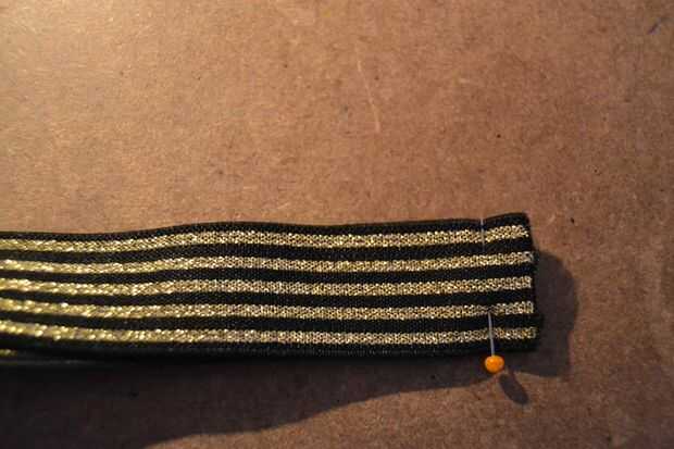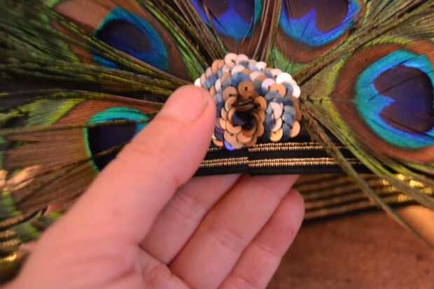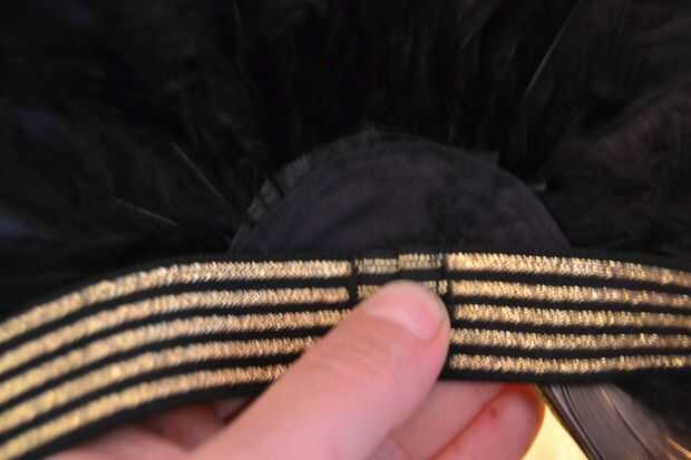 mano ahora coser lo featherpiece a la banda de elasic. coser la parte posterior de la pieza para que la costura no puede ser vista de frente.