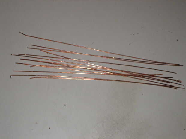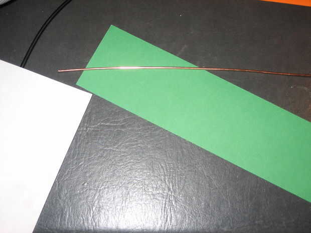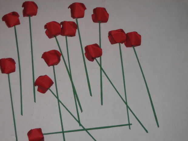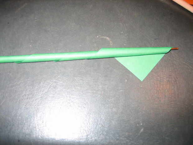 El alambre de cobre primero fue enderezado tirando el cable con un extremo en un vicio. Una vez estirado el alambre fue cortado en tiras de 30cm. Cada cable se extendió luego con papel verde y el extremo pegado. Es posible hacer tallos sin el alambre girando sólo papel.