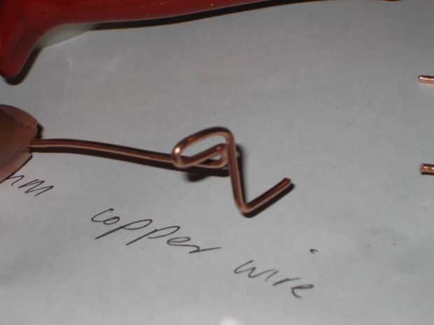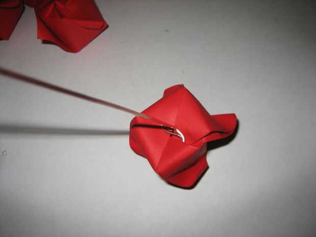 Necesitaba un método simple para sujetar los tallos a las cabezas de color de rosa. Cada extremo del alambre se doblado en una forma que las cabezas se levantó para simplemente ser trenzado en el cable. Luego se aplicó pegamento.