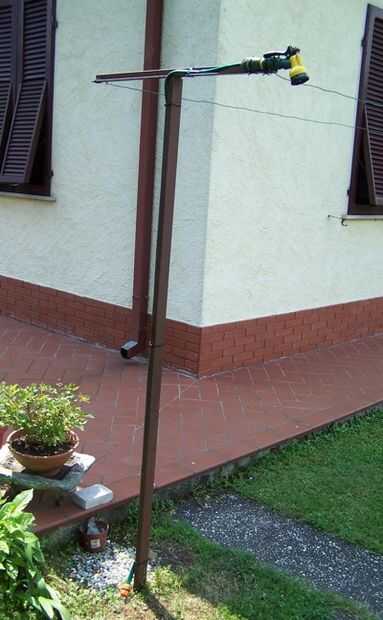 Ahora basta con fijar la manguera al polo con los lazos del cierre relámpago. En la primera foto verás cómo lo hice. Conecte la manguera a la manguera principal conectada al grifo de su jardín y deje que el agua refrescante libre.