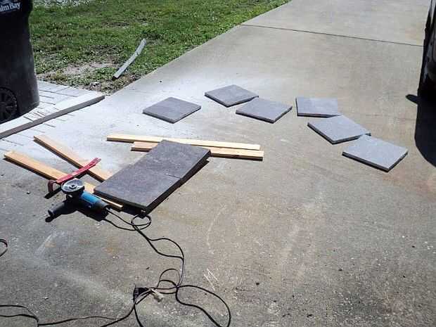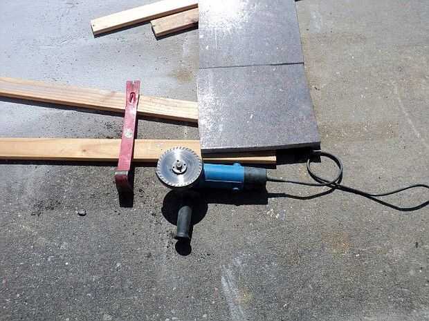 Después de considerar las cualidades de la losa y las áreas a distribuir, decidimos cortar en 12"(30,5 cm) x 12" tamaño y utilizar una amoladora con un disco de diamante corte seco. Era un trabajo bastante fácil, y un profundo corte de puntuación permite un broche de presión simple acción para completar la separación, lo suficientemente limpia como para el uso previsto. Permitiendo que los bordes que quedan crudas, con el tiempo, tendrá un aspecto más natural "live edge".