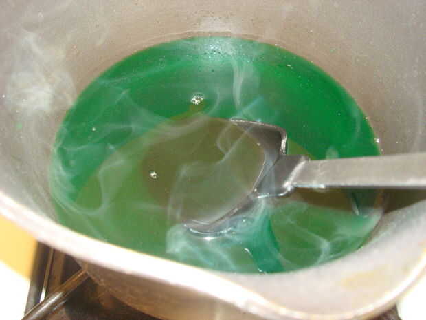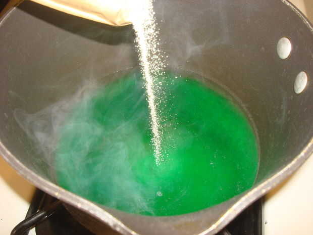 Caliente 2 tazas de agua hasta que hierva. Apagar el fuego. Agregar la gelatina y revolver hasta que se disuelva el azúcar Jell-o. Deja enfriar a temperatura ambiente.