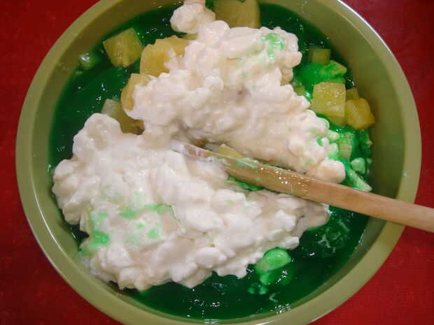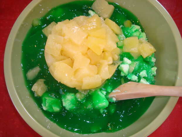 Sacar la mezcla de la gelatina de la nevera. Añadir la piña drenada, apio, queso y nueces. Mezclar bien. Coloque en el refrigerador hasta que esté firme.