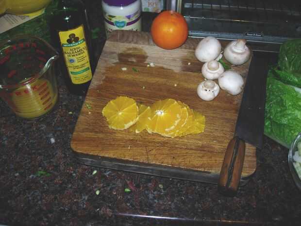 4 pelar, quitar la corteza y Rebane finamente la naranja (no demasiado fino, o baja aparte),