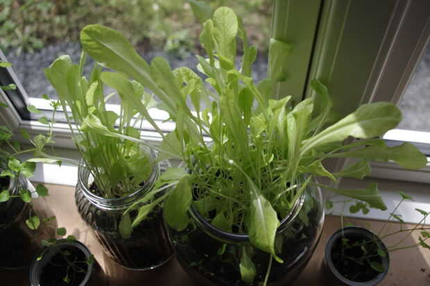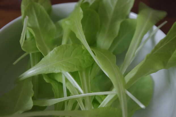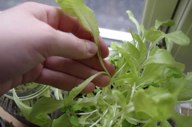 Como el momento de publicar este instructable funcionaba, decidí cosechar algunas hojas temprano. (Esto era un placer, como las hojas jóvenes son tan dulce y fresco!) Había convertido en un tamaño de captura, pero puede conseguir mucho más grandes, y cuando están en su mayor reciben un color rojo alrededor de los bordes de las hojas. Cosechar lo suficiente para una ensalada, pero dejó el resto a crecer más. Muchas de las plantas se habían dividido en dos partes, y en casos como este cogió uno de ellos y deja el otro para crecer.