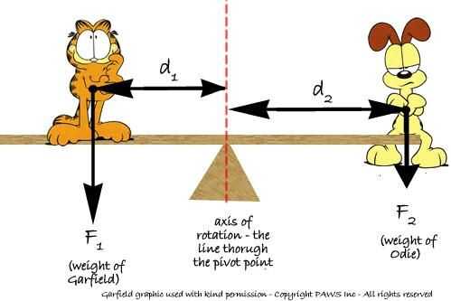 Una escala de equilibrio (véase el cuadro) es como una Teeter Totter (ver imagen) y ambos trabajan en los mismos principios de física (ver imagen de Garfield). La idea básica es longitudes iguales y equilibrio de pesos iguales (ver cuadro de Garfield).