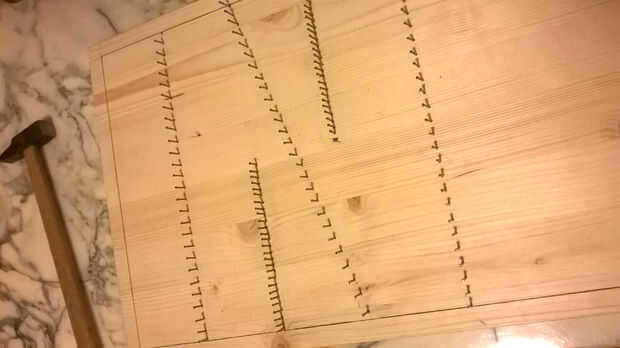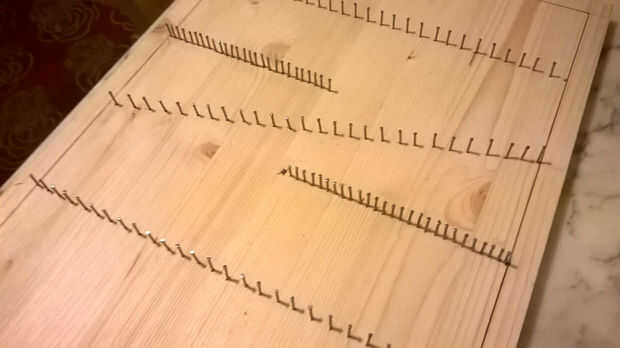 Toma los clavos y empezar a martillo en los puntos. Si usas las uñas largas de 25mm según lo sugerido, usted tiene que empujarlos dentro hasta que se detiene (el panel es 15mm de espesor para que las uñas se peep de 1 cm). Las partes más difíciles son seguramente las filas 2 y 4 porque las uñas están muy muy cercanas (sólo 5mm de distancia!) pero, aunque era la primera vez que he clavado algo, he conseguido hacerlo sin excesivos problemas. Imágenes 1 y 2 muestran el trabajo terminado.