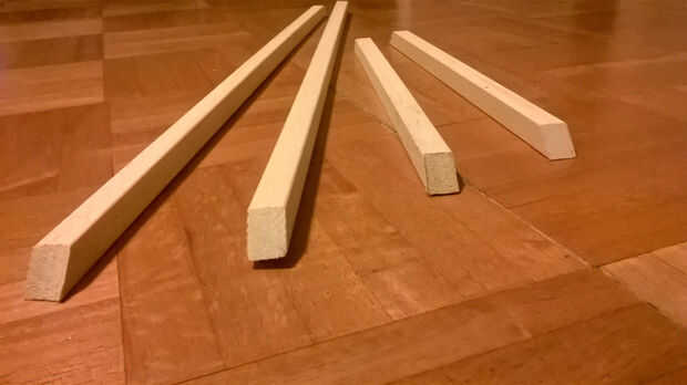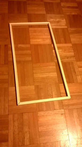 Recoger la tablilla y cortar de ella dos 30cm y dos trozos largos de 60cm. Cortar con cortes de 45 grados para que encajan en la forma del marco como se muestra en la figura 3. Luego pegar las piezas juntas (he puestos algunos clavos para ayudar a mí mismo) y pintar el marco con 2 o más capas de pintura. Al final pegar el marco al panel. (He perdido las fotos de la pintada del marco, lo sentimos!)