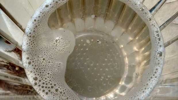 Adaptar las recomendaciones de una esponja guía encontré la agricultura, dio un ligero lavado de nuestra pequeña colección de sponge(like) en agua fresca con sobre una cucharadita de detergente para ropa. Agita las esponjas en el agua tibia y jabón. Incluso después de todos el lavado anterior, todavía se lavó algún material adicional de las esponjas en esta etapa.